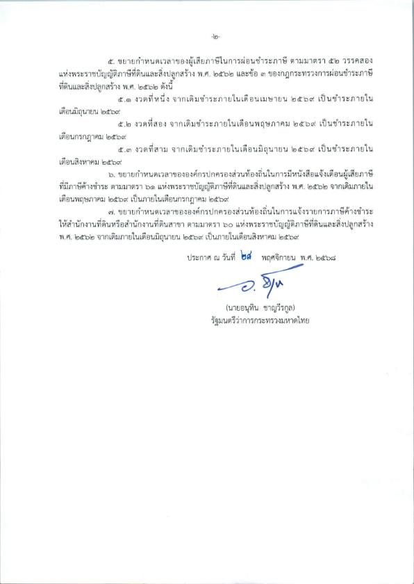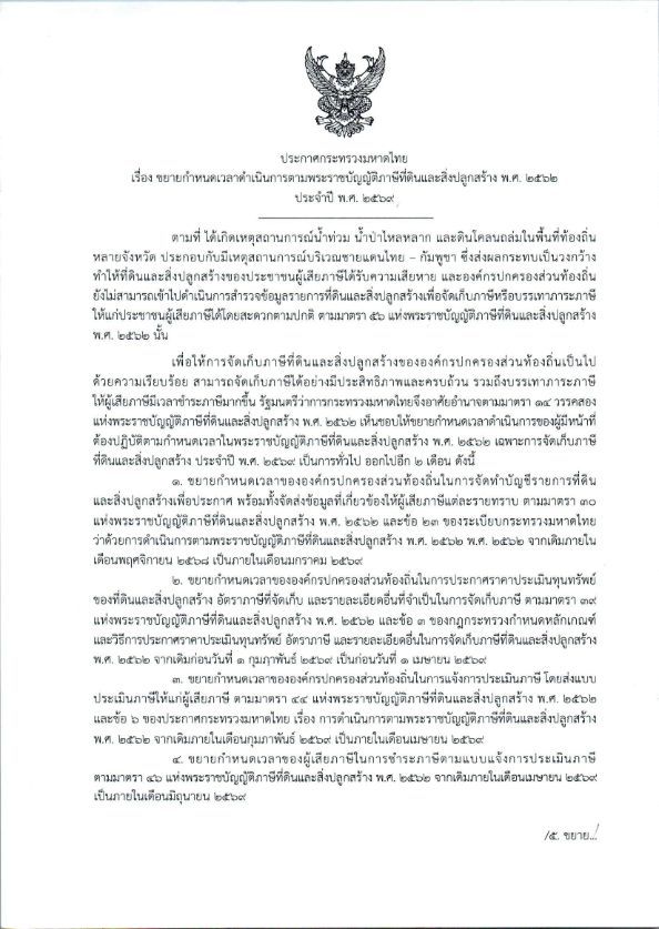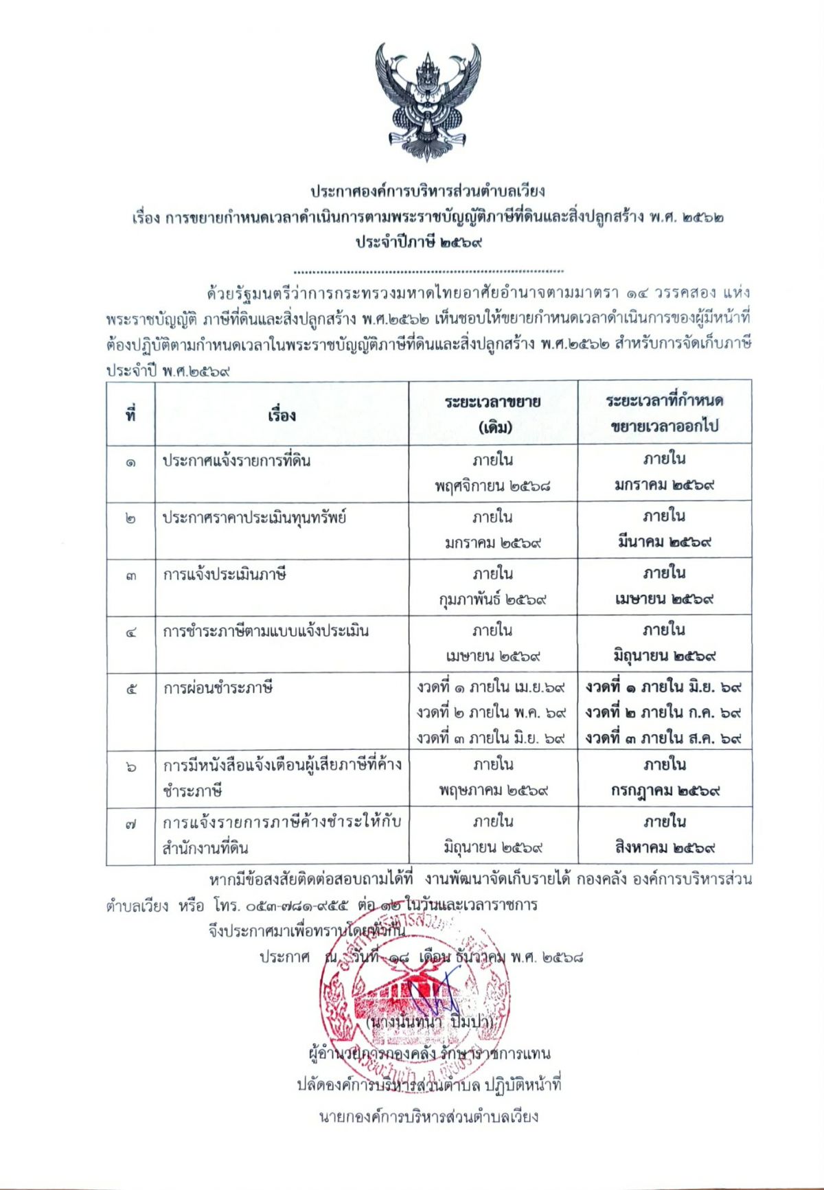 ประชาสัมพันธ์การขยายเวลาดำเนินการจัดเก็บภาษีที่ดินและสิ่งปลูกสร้าง ประจำปี2569 วันที่ 18 ธันวาคม 2568 [ 10:56 น. ] เข้าชม 18 ครั้ง พิมพ์ ข่าวประชาสัมพันธ์ ประชาสัมพันธ์การขยายเวลาดำเนินการจัดเก็บภาษีที่ดินและสิ่งปลูกสร้าง ประจำปี2569 อัลบั้มภาพ