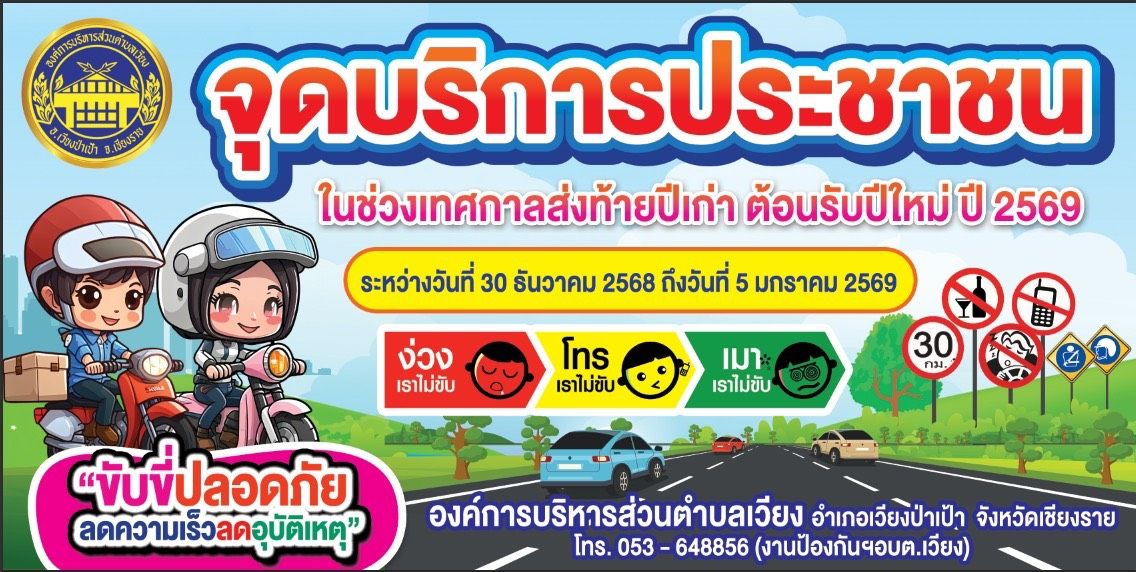 ประชาสัมพันธ์ องค์การบริหารส่วนตำบลเวียง ได้จัดตั้งจุดบริการประชาชน ส่งท้ายปีเก่า ต้อนรับปีใหม่ พ.ศ.2569 ระหว่างวันที่ 30 ธันวาคม 2568 - 5 มกราคม 2569 (7วันอันตราย) วันที่ 18 ธันวาคม 2568 [ 15:20 น. ] เข้าชม 17 ครั้ง พิมพ์ ข่าวประชาสัมพันธ์ ประชาสัมพันธ์ องค์การบริหารส่วนตำบลเวียง ได้จัดตั้งจุดบริการประชาชน ส่งท้ายปีเก่า ต้อนรับปีใหม่ พ.ศ.2569 ระหว่างวันที่ 30 ธันวาคม 2568 - 5 มกราคม 2569 (7วันอันตราย) อัลบั้มภาพ