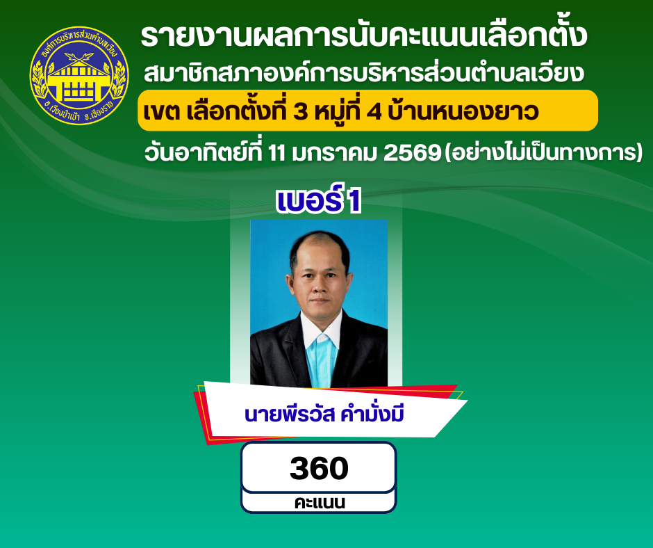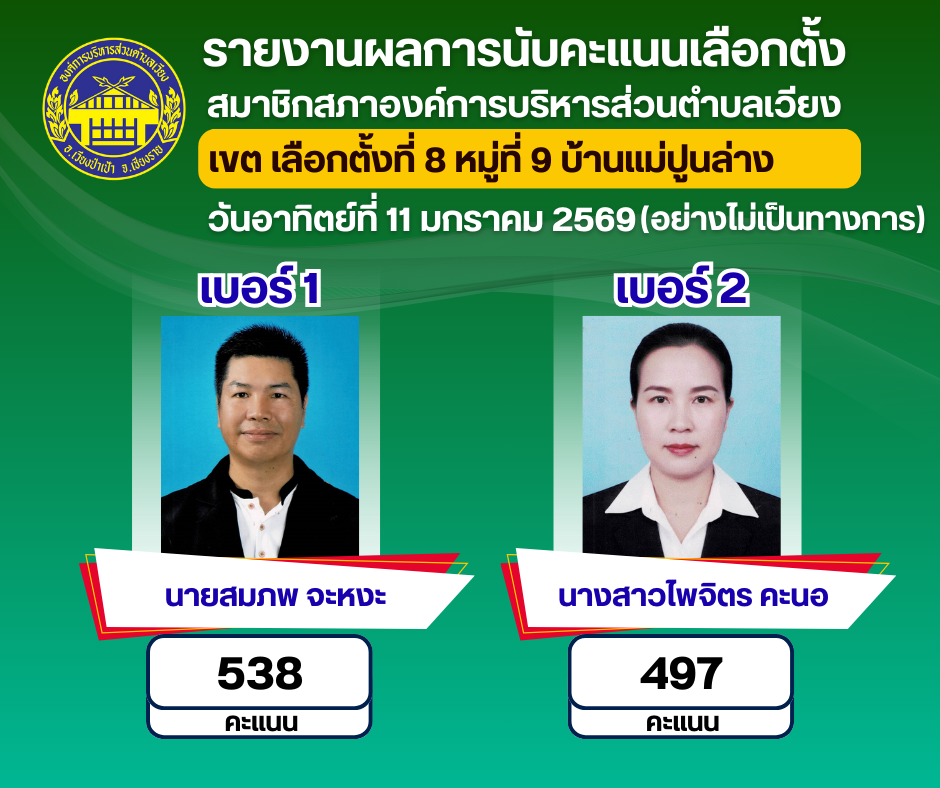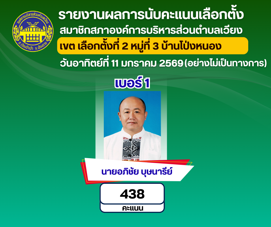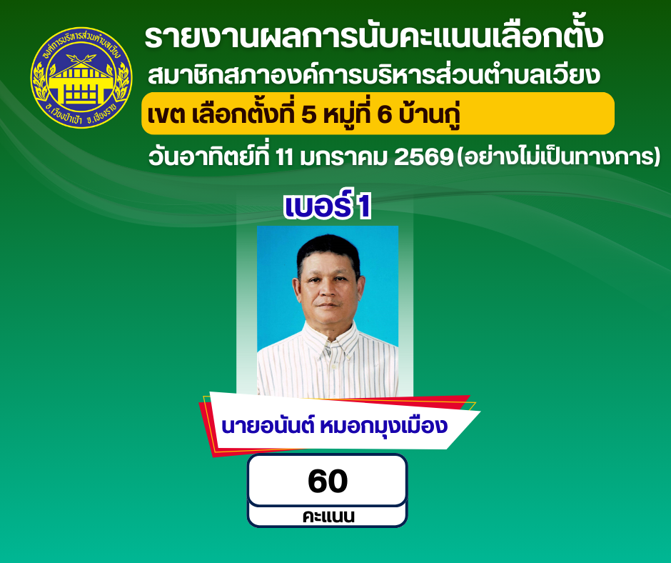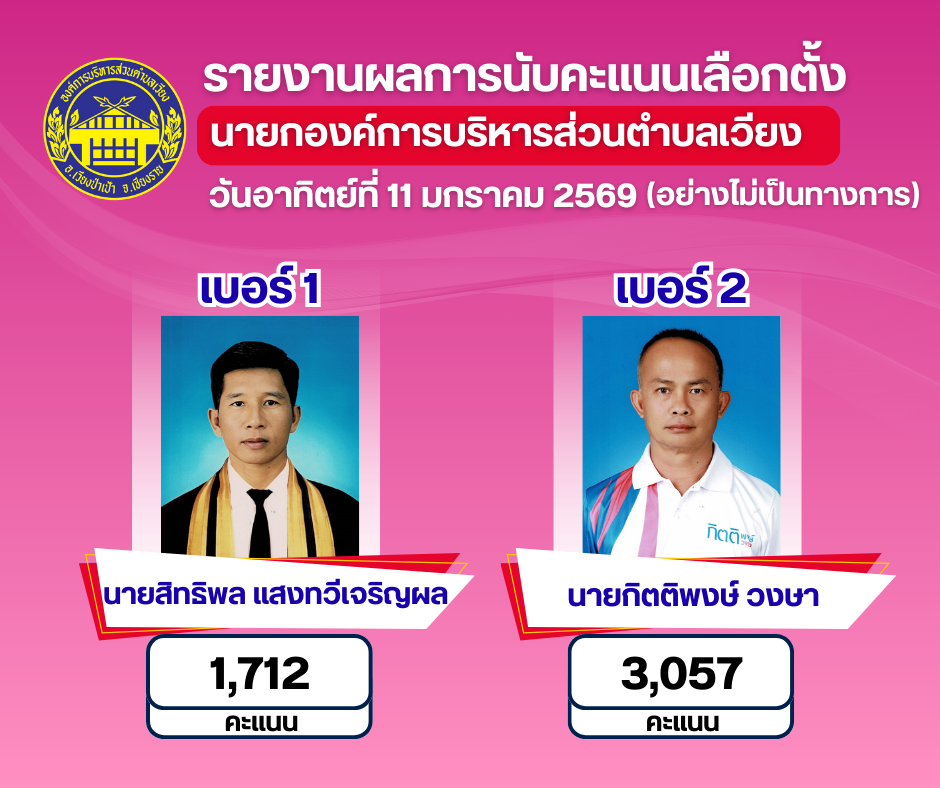 รายงานผลการนับคะแนนการเลือกตั้ง สมาชิกสภาองค์การบริหารส่วนตำบลเวียง และนายกองค์การบริหารส่วนตำบลเวียง (อย่างไม่เป็นทางการ) วันที่ 11 มกราคม 2569 [ 13:12 น. ] เข้าชม 169 ครั้ง พิมพ์ ข่าวประชาสัมพันธ์ รายงานผลการนับคะแนนการเลือกตั้ง สมาชิกสภาองค์การบริหารส่วนตำบลเวียง และนายกองค์การบริหารส่วนตำบลเวียง (อย่างไม่เป็นทางการ) อัลบั้มภาพ