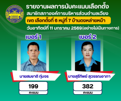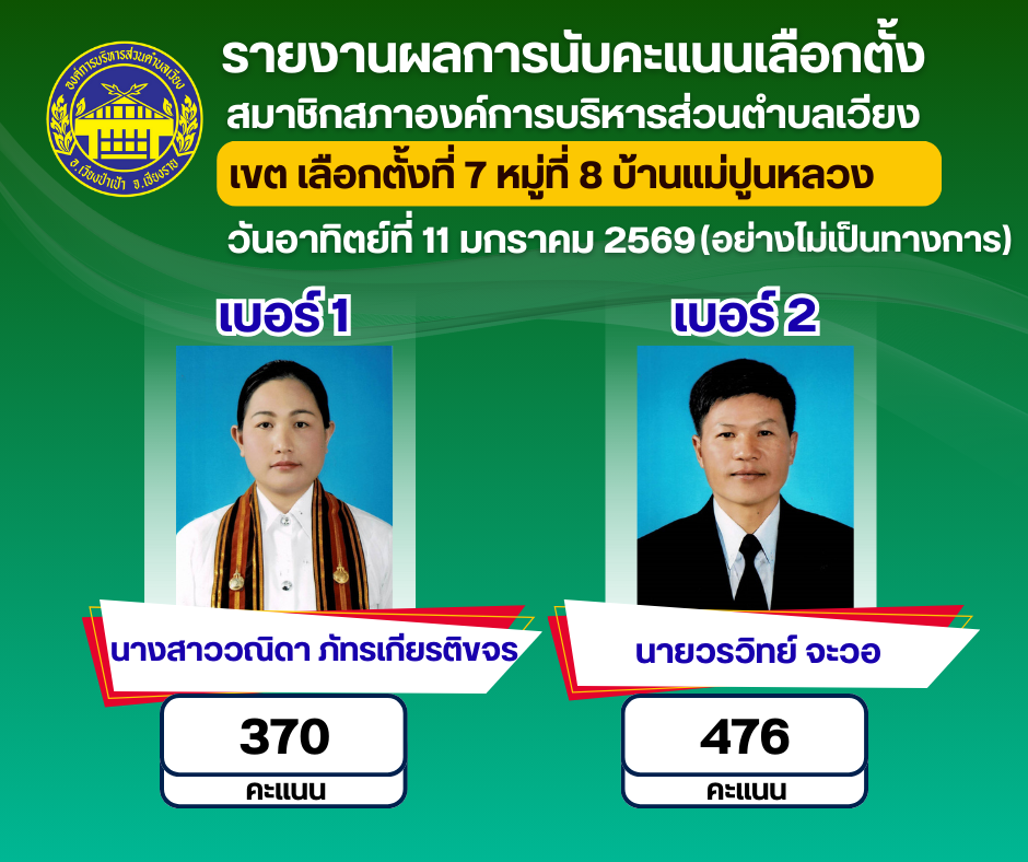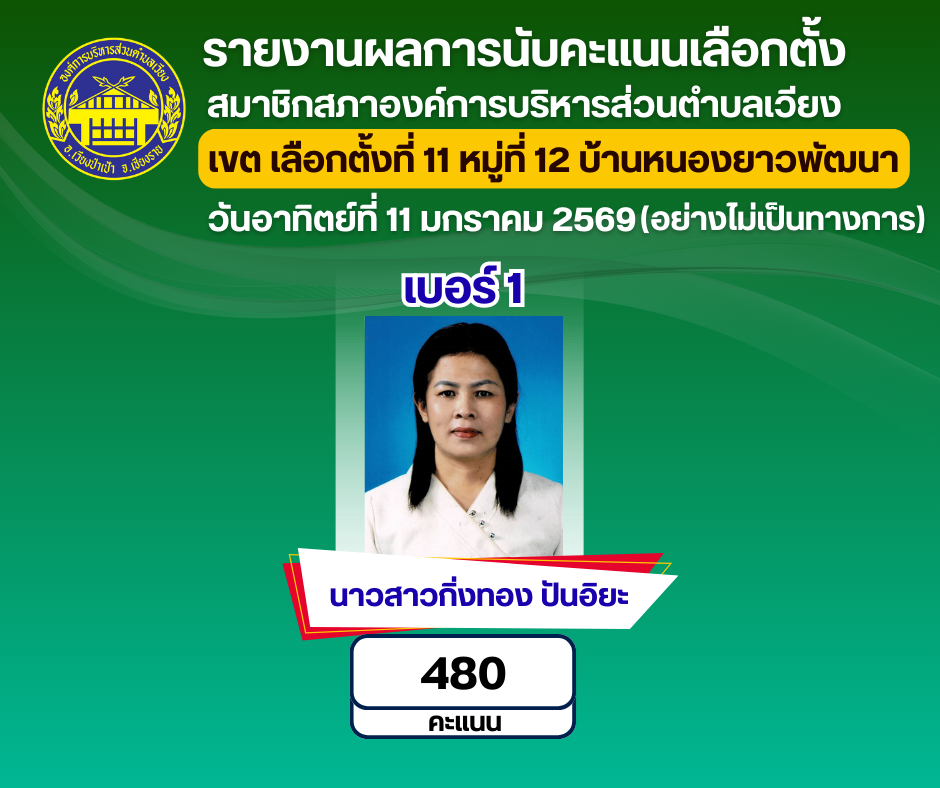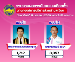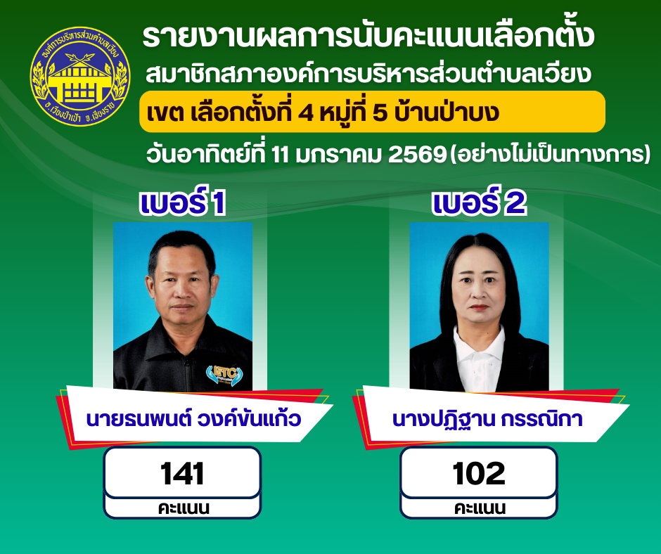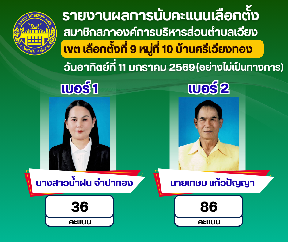 รายงานผลการนับคะแนนการเลือกตั้ง สมาชิกสภาองค์การบริหารส่วนตำบลเวียง และนายกองค์การบริหารส่วนตำบลเวียง (อย่างไม่เป็นทางการ) วันที่ 11 มกราคม 2569 [ 13:12 น. ] เข้าชม 169 ครั้ง พิมพ์ ข่าวประชาสัมพันธ์ รายงานผลการนับคะแนนการเลือกตั้ง สมาชิกสภาองค์การบริหารส่วนตำบลเวียง และนายกองค์การบริหารส่วนตำบลเวียง (อย่างไม่เป็นทางการ) อัลบั้มภาพ